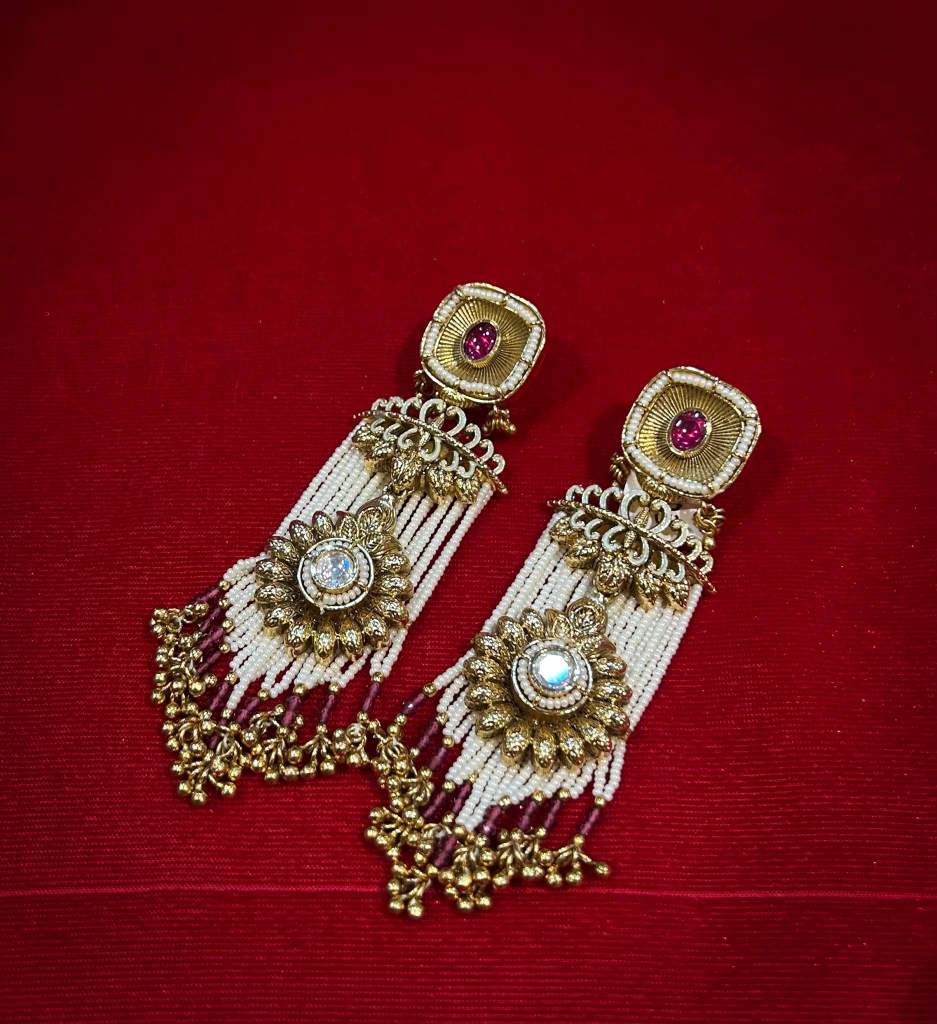 Elegant golden earrings adorned with delicate beads, perfect for adding a touch of sophistication to any outfit.