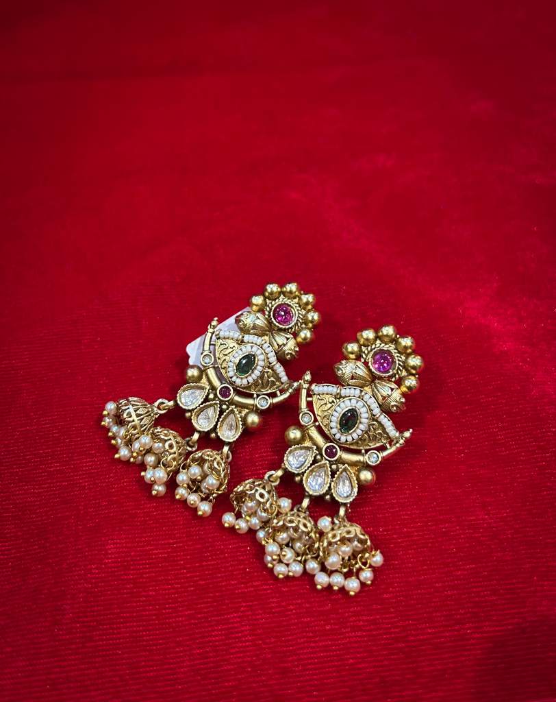 Elegant golden earrings adorned with delicate small jhumka in bottom.