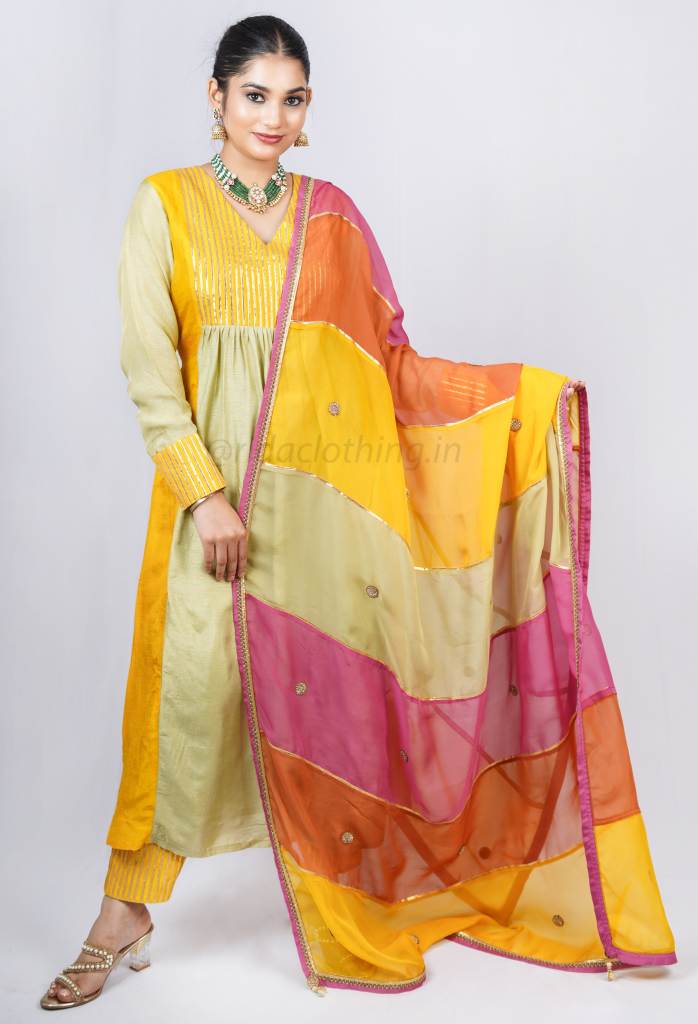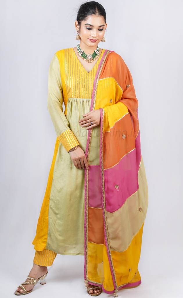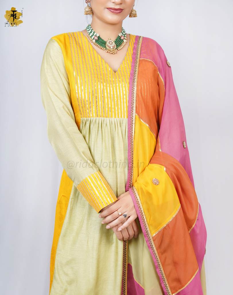 KURTI - This elegant kurti features a V-neckline in the front and a closed back neck, with a beautifully embellished Gota Patti yoke and full sleeves. Designed in a dual-tone palette of pista green and yellow, it blends subtlety with festive elegance.