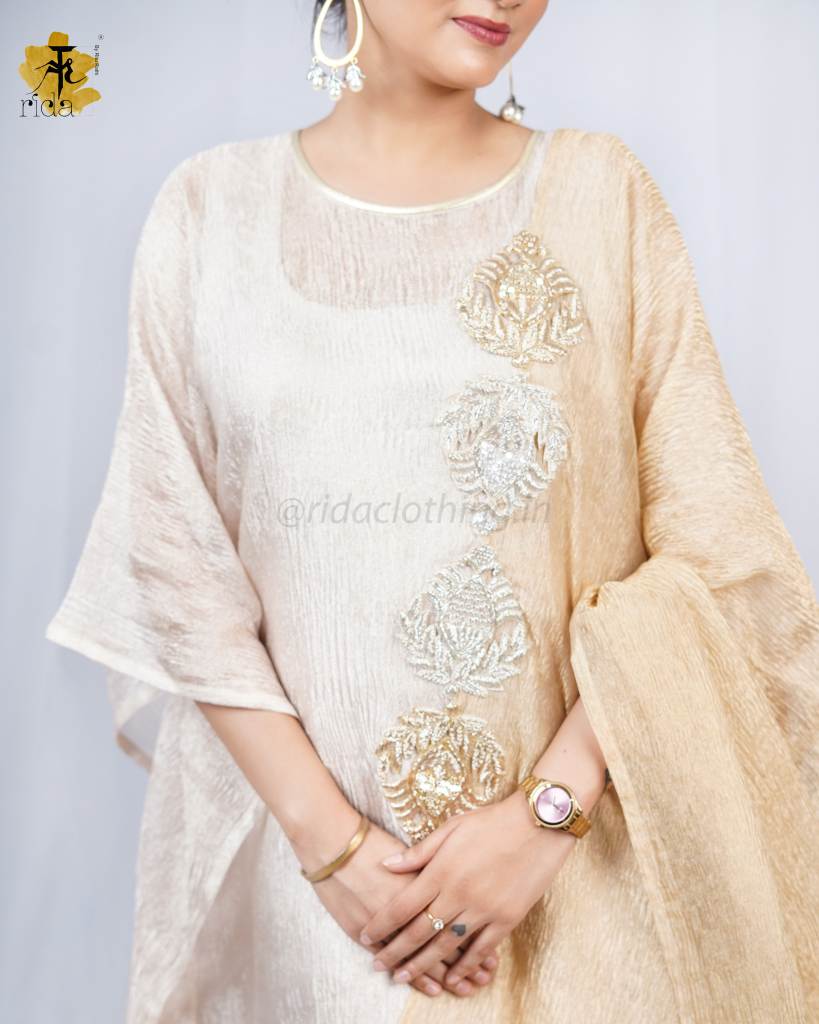 Make a statement in our luxurious crush kaftan, bathed in glimmering shades of gold and silver. Crafted from rich crushed fabric, it flows effortlessly, offering both comfort and grandeur.
