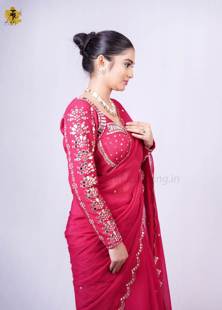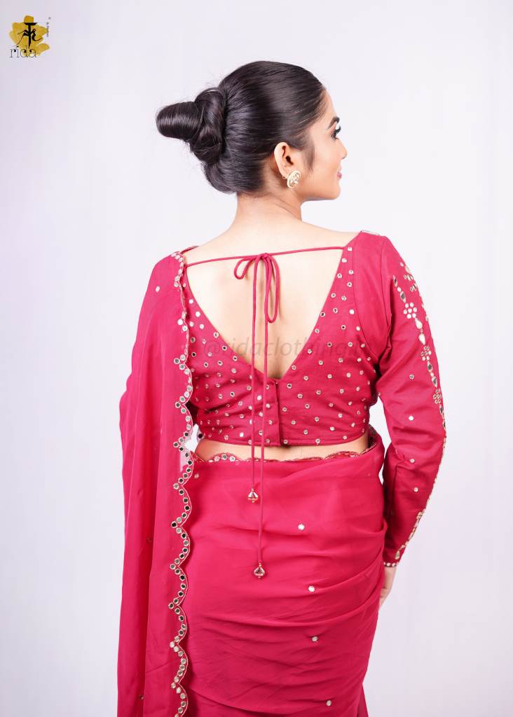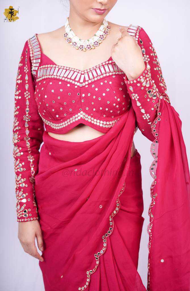 BLOUSE- The blouse is richly embroidered with all-over mirror work, creating a bold and radiant look. Designed with full sleeves for a regal touch, it features a stylish sweetheart neckline in the front and a sharp V-cut at the back, adding a beautiful balance of grace and glamour.