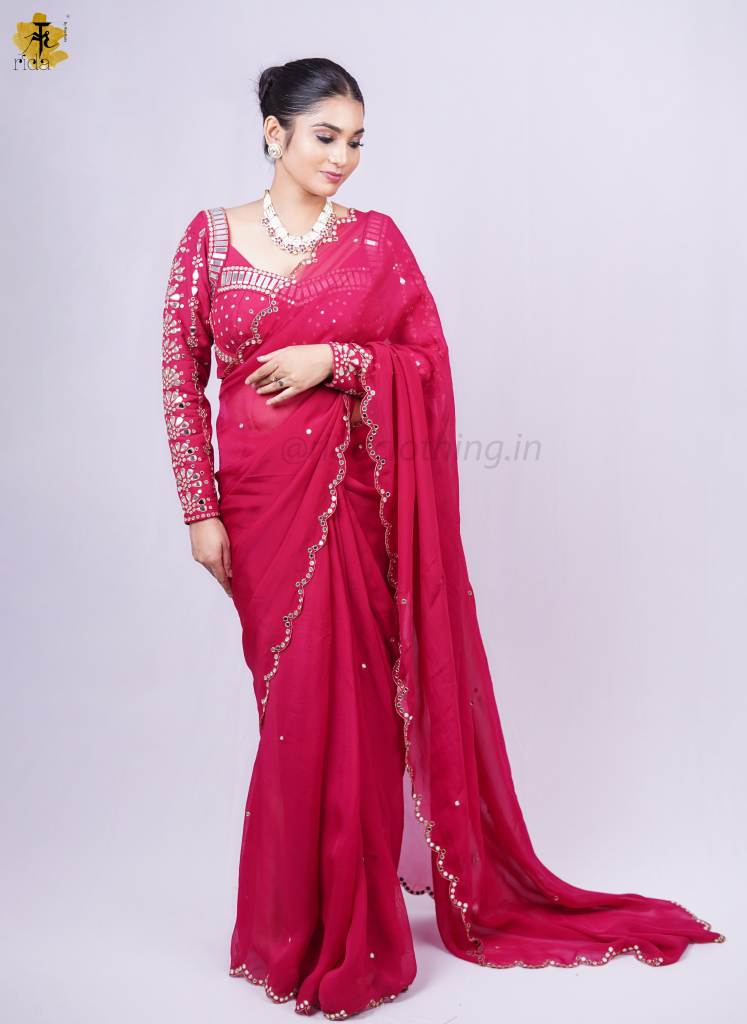 SAREE - A stunning saree that dazzles with every movement — featuring intricate mirror cutwork along the edges, giving it a festive shimmer and an elegant finish. The mirror detailing adds a contemporary twist to its traditional charm, making it a perfect pick for celebrations.