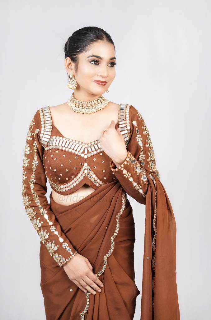 BLOUSE- The blouse is richly embroidered with all-over mirror work, creating a bold and radiant look. Designed with full sleeves for a regal touch, it features a stylish sweetheart neckline in the front and a sharp V-cut at the back, adding a beautiful balance of grace and glamour.
