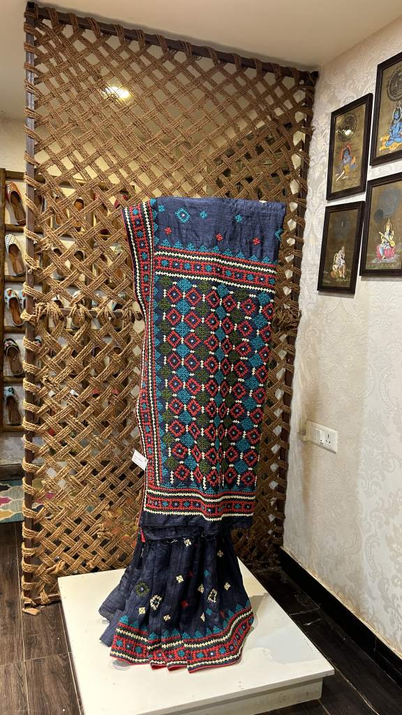 Discover this stunning Sindhi embroidery saree . The saree features a rich midnight blue base adorned with intricate Sindhi work, which is traditional done by hand .